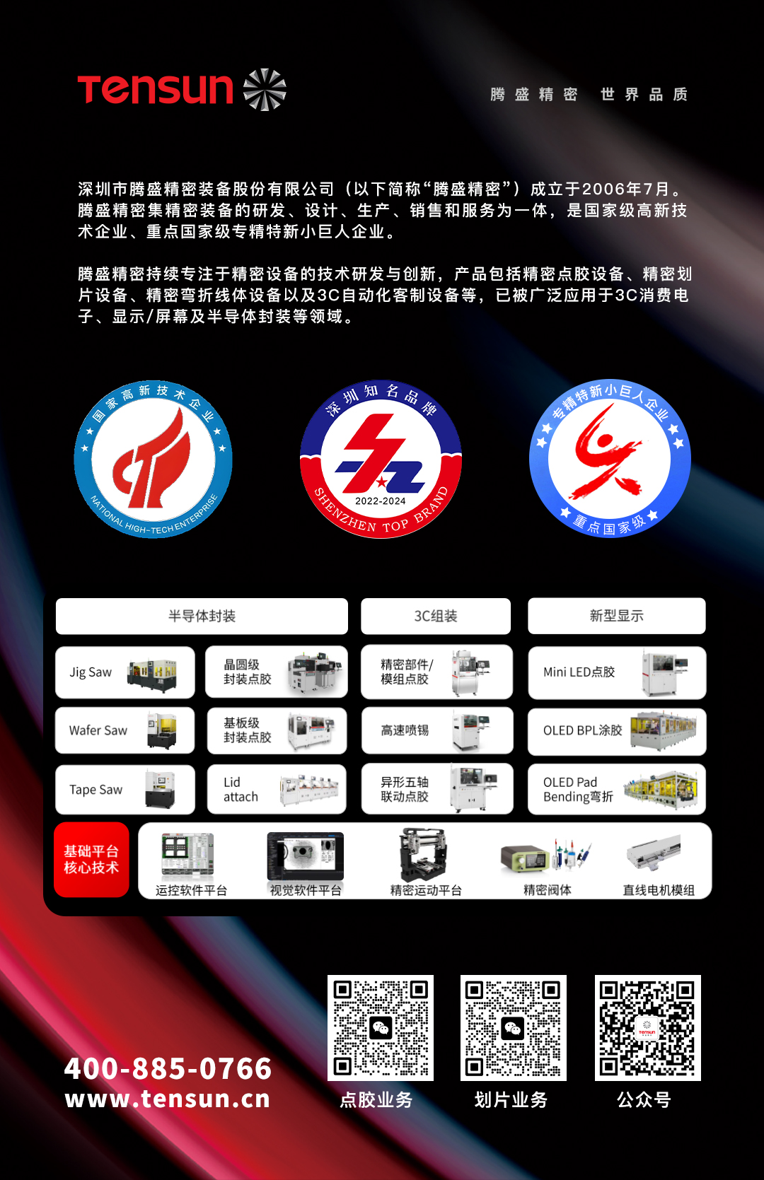 Tensun騰盛精密于2006年開始推出桌面式點(diǎn)膠機(jī)布局3C市場(chǎng),持續(xù)研發(fā)創(chuàng)新精密點(diǎn)膠工藝,在OLED、Mini LED、Micro LED等領(lǐng)域積累了豐富的精密點(diǎn)膠解決方案。