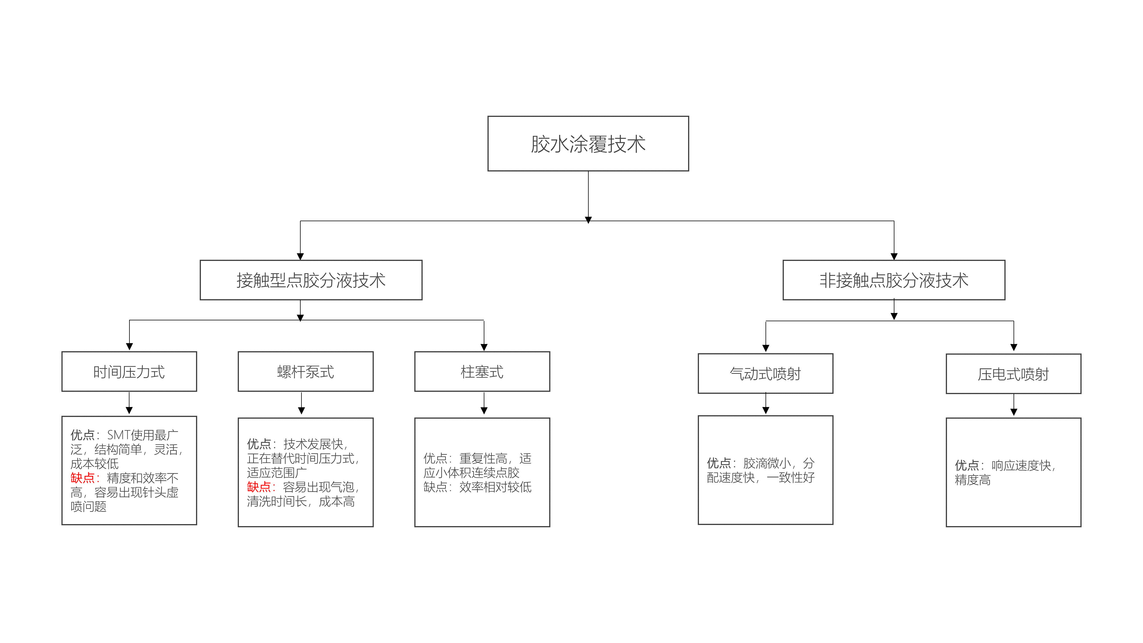 微電子封裝工業(yè)中主要有點(diǎn)、線、面三種點(diǎn)膠涂覆技術(shù),即可分為接觸式點(diǎn)膠、非接觸式點(diǎn)膠。